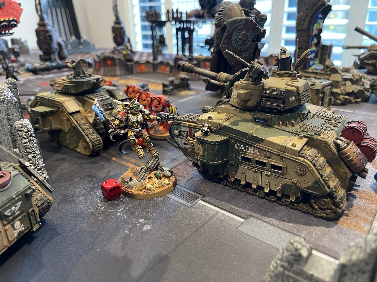 Dunk:With the Blood Angels in my lines, I had to pour the fire on and bring as many of them down as possible. I did ok and Garfy took casualties, BUT, it didn’t stop his relentless advance. Ursula Creed can order vehicles (via stratagem) and honestly, I was spamming the “take aim” stratagem as often as I could, literally hammering the Blood Angels with all my heavy cannons and blast weapons. Pouring it on!