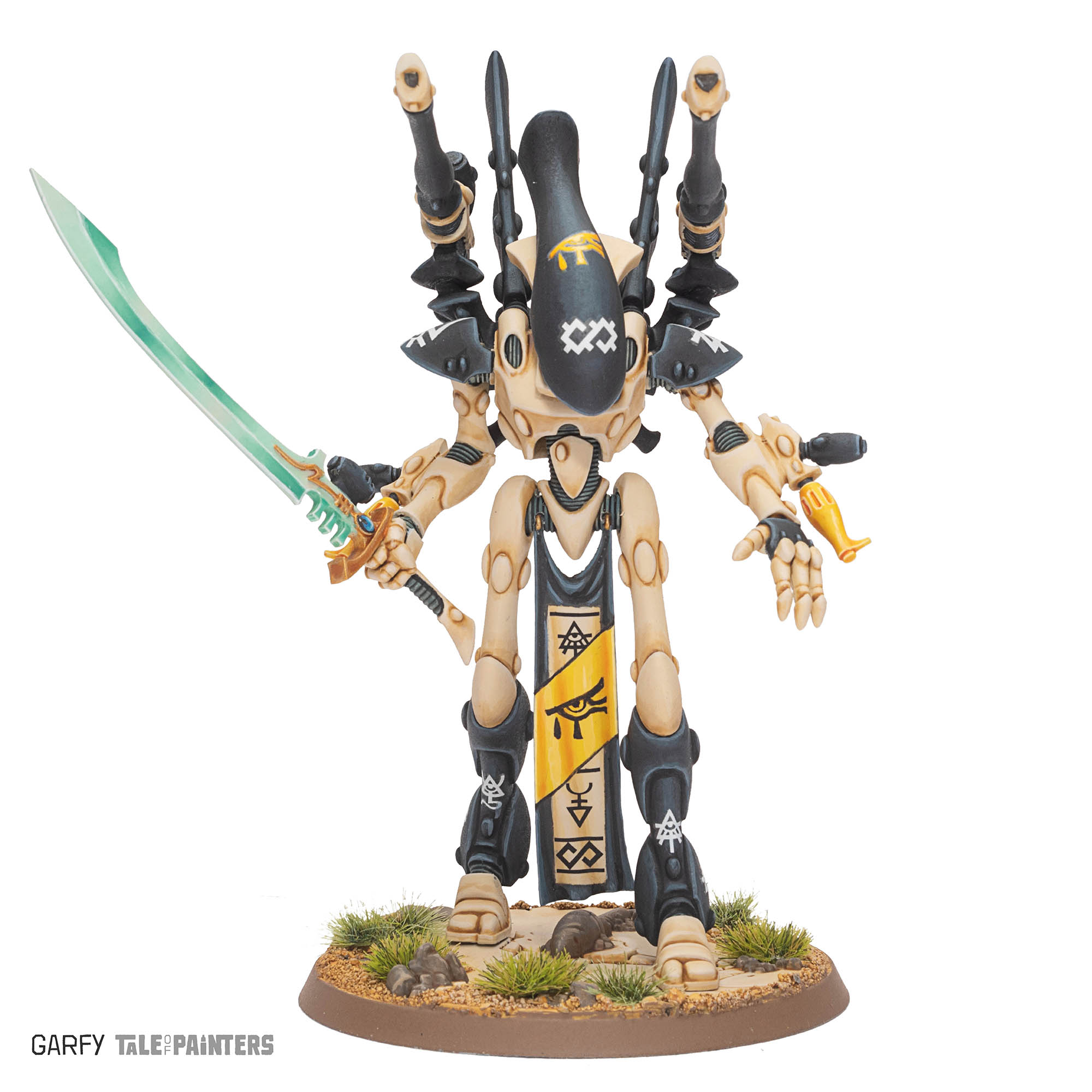 What I love about the classic Eldar Dreadnought colour scheme is the use of bone. Asuryani (Craftworld Eldar) craft a lot of their equipment and machines from Wraithbone. Wraithbone is a solid that can exist in real space formed from psychic thoughts pulled from the warp. Aeldari on the path of the artisan will train to become skilled in Wraithbone sculptures. Technical, complex machinery will be made by Aeldari Bonesingers. It makes so much more sense to feature a lot of bone colour on a wraith construct. The bone also has a subliminal undead vibe.