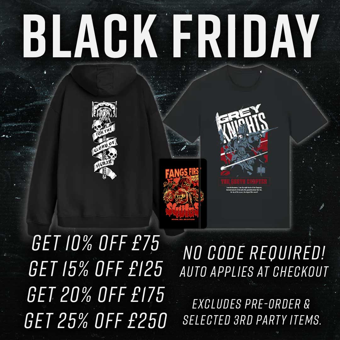 Warhammer Merch has official licensed tees, hoodies, and accessories, and you can save up to 25%, tiered by order value. Note that while the graphic shows British Pounds, this offer is available worldwide (order tier values might be different depending on your local currency).